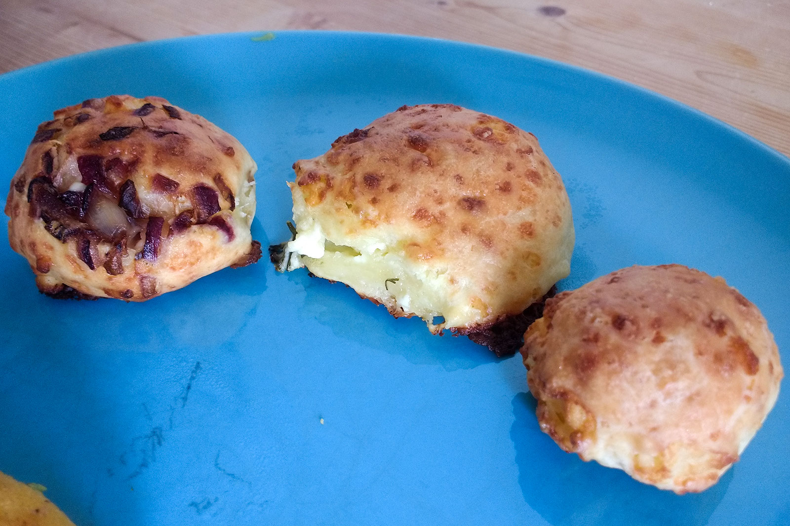 Die Cunape vor dem Backen – mit Zwiebeln, mit Frischkäse-Schnittlauch und Pur