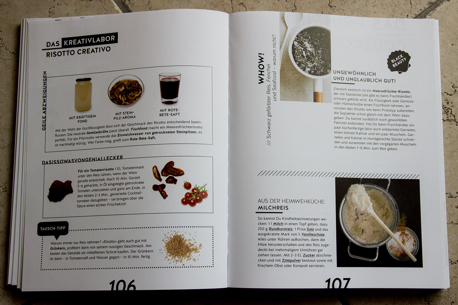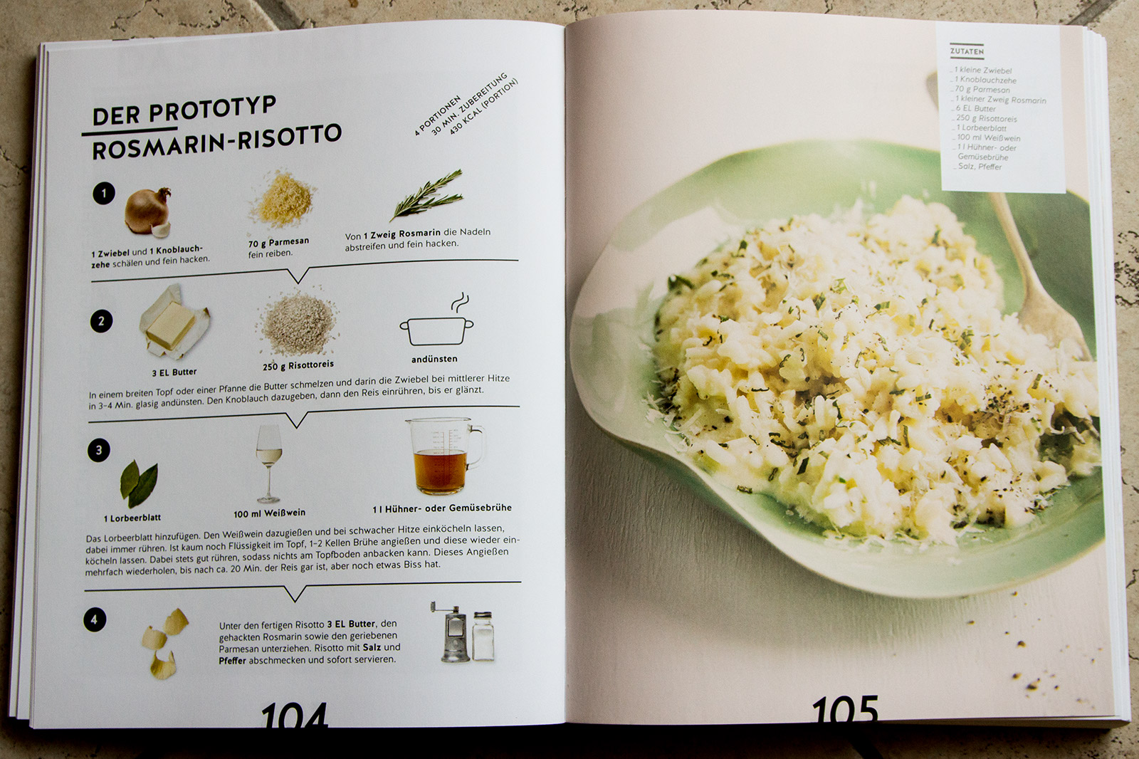 Jedes Prinzip wird dabei über drei Doppelseiten dargestellt – immer nach dem gleichen Aufbau: die erste Seite erklärt das Rezept bzw. die Grundzutaten und stellt die Reihenfolge des Rezepts mit klaren, einfachen Icons dar. Auf der nächsten Seite folgt dann eine Prototyp-Rezept und die letzte – und meiner Meinung nach Coolste/Interessanteste – stellt das Kreativlabor. Hier sind nur Tipps wie man selber zu Varianten kommt und da ist von „eh klar“ bis zu „wow – coole Idee, hätte ich nie dran gedacht“ alles dabei.